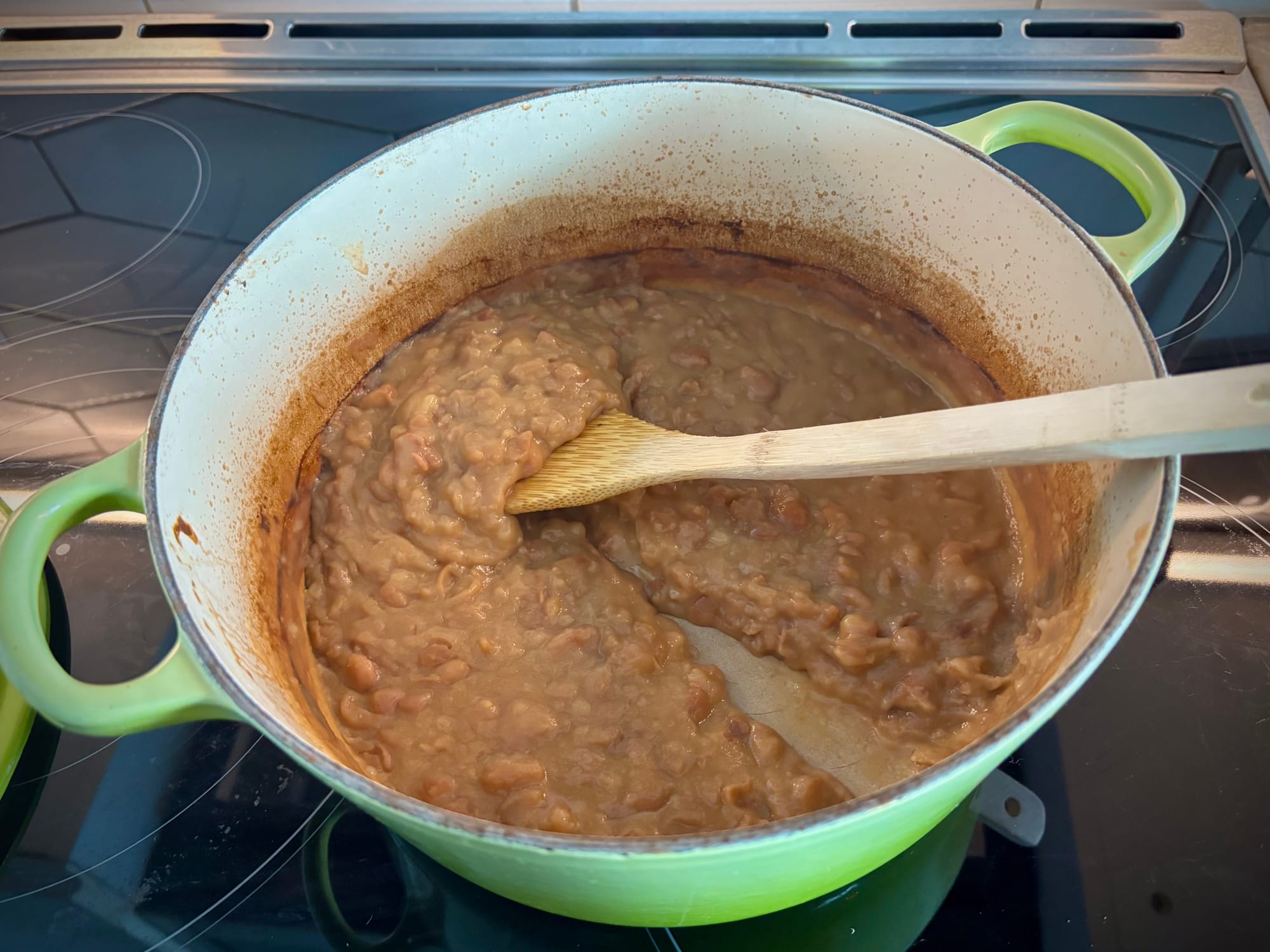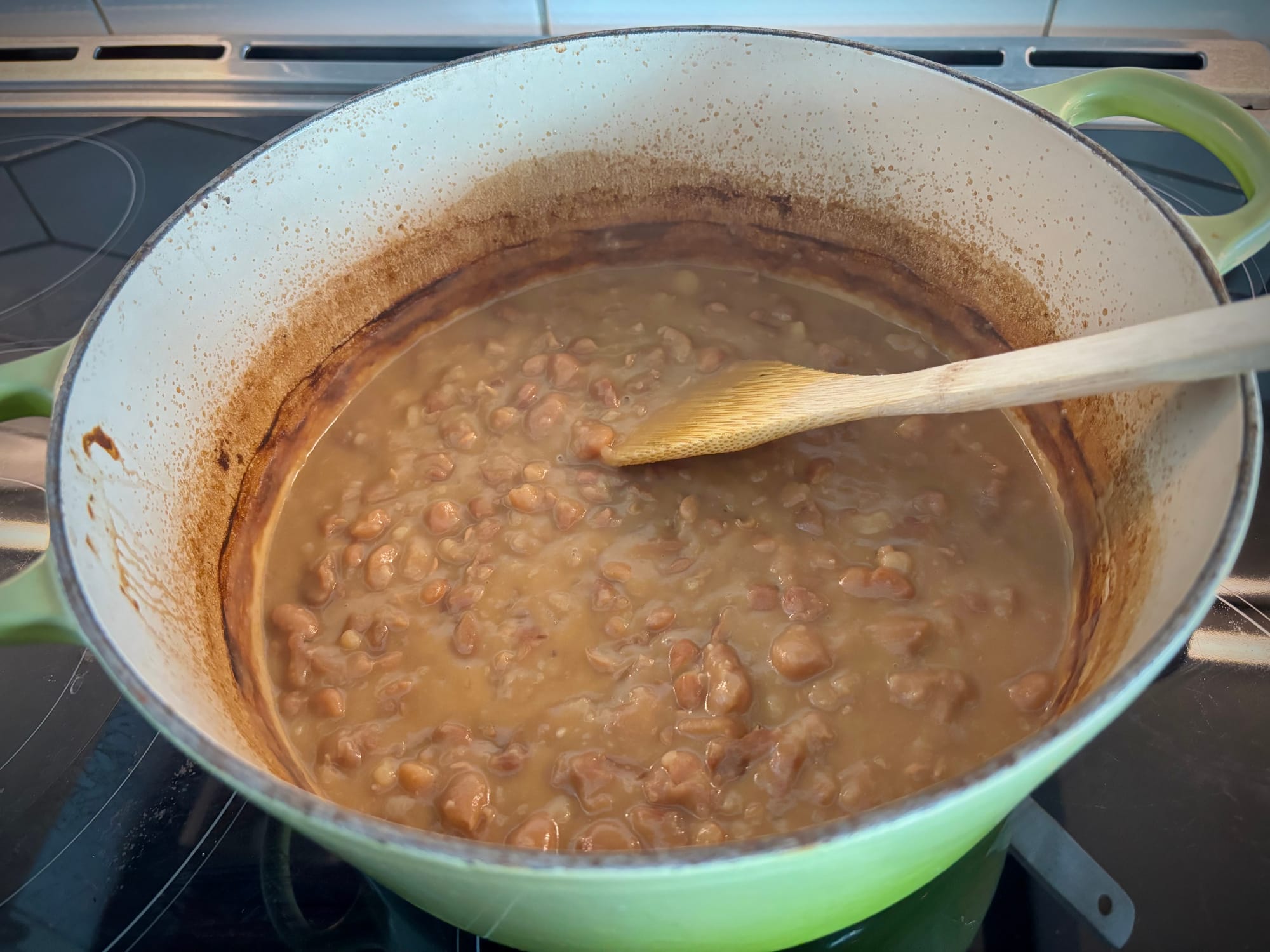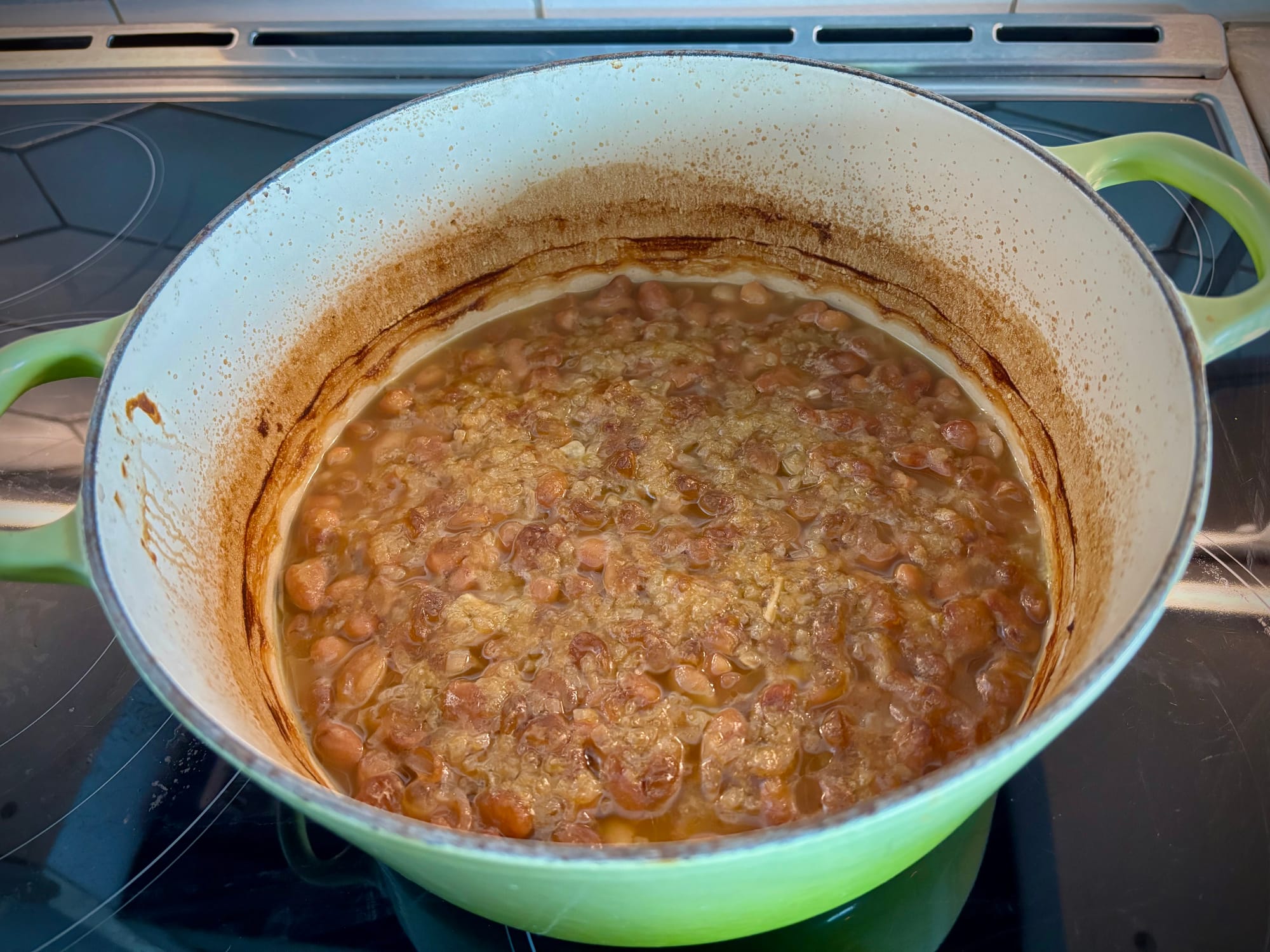 Once the liquid has reduced significantly (a couple/three hours), give everything a really good stir. Unlike baked beans, we want the beans to break apart. So don't be shy with the spoon! The final consistency is up to you (and how you plan to eat them), but I'm happy when the beans are thick enough that you can see the bottom of the pot when you stir them.